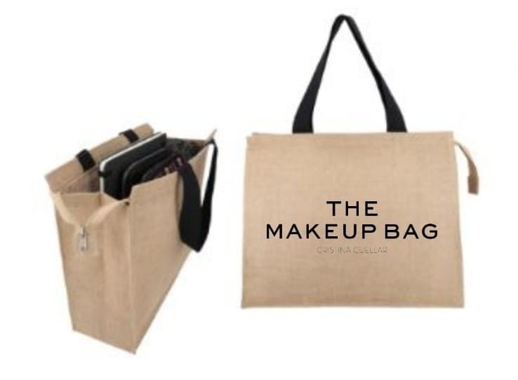 Bolsa de yute con impresión negra, con cierre y asas negras.